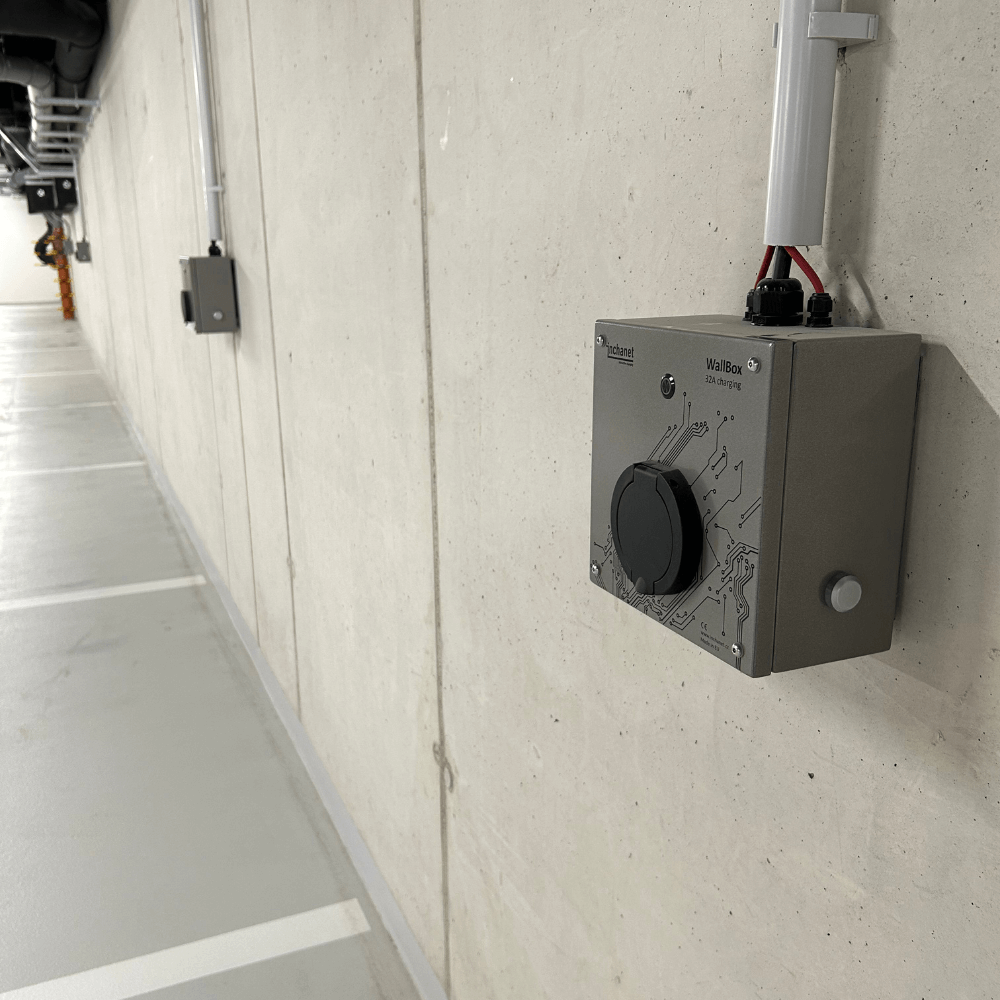 V rámci výstavby parkovacích míst v podzemní garáži bytového domu byly vybrané parkovací stání osazeny AC nabíjecí stanicí pro elektromobily. Každá stanice je dostupná pouze oprávněným uživatelům pomocí autorizačního RFID čipu, čímž je zajištěna kontrola přístupu a bezpečný provoz.